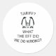 Pegatina burlándose de lo absurdo de tarificar una isla ocupada por pingüinos. El diseño incluye pingüinos y texto que dice "¿Aranceles? ¿Qué Fe Hicimos Mal?" Todos los elementos del diseño son personalizable, incluyendo contenido textual y color.