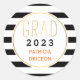 Pegatina de graduación de rayas blancas negras 2016. Un patrón rayado en blanco y negro, la palabra "GRAD" en oro en una letra delgada y tu texto en negro y coral son los elementos de este pegatina de graduación.