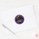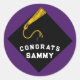 Pegatinas clásicos de regalo de graduación o etiquetas de fiesta con gorro negro de graduación con tassel dorado sobre fondo morado. Editar texto para agregar el nombre de la clase superior.