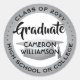 Añada un toque elegante y personalizado a los anuncios de graduación de la universidad o la escuela secundaria y a las invitaciones con estos modernos pegatinas/sellos para sobres redondos de caligrafía. El diseño incluye una pizarra de mortero con gorro de Relieve metalizado metálico de color plateado y un elegante nombre de graduado en tipografía negra, escuela y año de clase. Hace una moda personalizada a los favores y decoraciones de las fiestas de graduación. Como opción, cambie el texto curvo a un nombre y dirección para usarlos como etiquetas de dirección de retorno redondeadas en invitaciones o notas de agradecimiento.