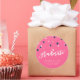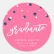 Elegante pegatina de graduación redonda con la palabra "Graduado" en un guión de moda de pincel blanco contra fondo rosa con confeti blanco y azul esparcidos por encima. Utilícelo para sellar los sobres, los bolsos de bienvenida o la decoración. Consulta los elementos coincidentes de la fiesta de graduación aquí https://www.zazzle.com/collections/119637323833384053?rf=238364477188679314 Personalízalo con tus detalles reemplazando el texto del marcador de posición. Para obtener más opciones, como cambiar el tipo de letra, el tamaño/color del texto o el espaciado entre letras, haga clic en el botón "Personalizar". *Tenga en cuenta que la marca de agua Zazzle que aparece en la vista previa del zoom NO aparecerá en el producto impreso final © Rosewood and Citrus