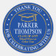 Añade un toque elegante personalizado a la universidad o a la graduación de la escuela secundaria gracias a las tarjetas y favores de fiesta con pegatinas/sellos para sobres redondos de color azul real, blanco y amarillo dorado. Todo el texto es sencillo para el personalizar. El diseño presenta un fondo azul, una tapa de cartón amarillo y una tipografía moderna. El texto incluye el año de clase, el nombre de la escuela y una línea opcional para el grado, los honores o la cita inspiradora favorita. Para usar como etiquetas de dirección de retorno redondeadas en las invitaciones o notas de agradecimiento, cambie el texto curvo a un nombre y dirección. ¡Felicitaciones al graduado!