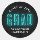 Modernos pegatinas de graduación con "Grad" en letras de neón cian con fondo negro. Personalice a los pegatinas de graduación de neón añadiendo el nombre del graduado y el año de graduación. ¡Los pegatinas de graduación personalizados son perfectos para sellar sobres de graduación y bolsas de favores! Diseñado para coordinar con nuestra moderna colección de graduación de neones.