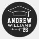 Los pegatinas personalizados de graduación redondos presentan un diseño en blanco y negro con un tapón de graduación y un texto personalizado para el nombre del graduado y el año de clase. El color de fondo se puede modificar para que se coordine con los colores de la escuela o del fiesta.