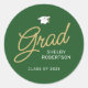 Pegatina de graduación redonda en verde y oro perfecto para sellar invitaciones o invitaciones. El diseño presenta la palabra "grad" en un guión moderno y elegante de escritura a mano en oro sobre un fondo verde oscuro.