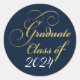 Elegante pegatina de graduación de oro y azul para adjuntar a los anuncios de graduación, las imitaciones de la fiesta de graduación, guardar la fecha y otra correspondencia del documento de graduación. Perfecto para la clase graduada de 2024. Tipo de letra elegante del guión.
