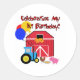 A los niños que les encantan las granjas y los animales de granja les encantará este colorido y divertido diseño de la primera fiesta de cumpleaños que incluye un granero rojo, un tractor azul, un cerdo, pollo, globos y un texto que dice "¡Celebrando mi primer cumpleaños!".