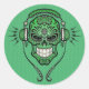 Este elaborado diseño de cráneo de azucar DJ está decorado con complejos remolinos y patrones de puntos. Los audífonos se sientan encima del cráneo con dos cables colgando debajo. Una sombra cae sobre el fondo de malla circular, lo que hace que parezca que el cráneo está flotando justo encima de la superficie. Esta agresiva imagen inspirada en el Día de los Muertos es perfecta para músicos y amantes de la música.