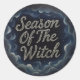 This fantasy sticker features a typography in grey blue black misty clouds with the words Season Of the Witch in a flowing cursive script. Finished as an oil paint art print.
