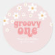 Pegatina Redonda Groovy One Retro daisy boho floral primer cumpleañ
