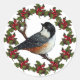 Este es mi ilustracion original de un pollito esponjoso encaramado en una rama nevada en medio de una corona de Navidades de holly, bayas y conos de pino.