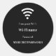 A Wi-Fi symbol. Add your wi-fi name and password for your customers/guests. Black background, white text.