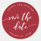 Pegatina elegante de "Save the Date" con las palabras "Save the Date" en una escritura cursiva relajada en blanco sobre un color de fondo editable (haga clic en personalizar para acceder).