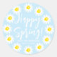 Feliz Primavera amarillo daisy flores marco floral borde personalizado personalizado texto alegre diversión pegatinas lindos, etiquetas, sellos para sobres, etiquetas de regalo, favores pegatinas. Texto de guión blanco de personalizable moderno, color azul pálido editable.