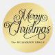 El flamante guión negro explica la Feliz Navidad con muchas flores ornamentales. Su nombre se escribe a continuación en simples letras de bloque. Elegante sello para sobres de oro y negro Feliz Navidad. Adición de moda al envoltorio de regalo. El oro es un neutro muy moderno que se completa con todos los colores.