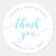 Gracias pegatina presentando las palabras "gracias" en un libreto cursivo relajante en azul pastel contra un fondo blanco. Personalízalo reemplazando el texto del marcador de posición. Para obtener más opciones como cambiar el tipo de letra y su tamaño/color, expanda la curva /contract o el espaciado entre letras haga clic en el botón "Personalizar". *Tenga en cuenta que la marca de agua Zazzle que aparece en la vista previa del zoom NO aparecerá en el producto impreso final. © Rosewood y Citrus
