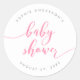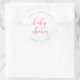 pegatina de Baby Shower con las palabras "Baby Shower" en un guión cursivo relajante en rosa contra fondo blanco. Personalízalo reemplazando el texto del marcador de posición. Para obtener más opciones como cambiar el tipo de letra y su tamaño/color, expanda la curva /contract o el espaciado entre letras haga clic en el botón "Personalizar". *Tenga en cuenta que la marca de agua Zazzle que aparece en la vista previa del zoom NO aparecerá en el producto impreso final. © Rosewood y Citrus
