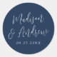 Elegantes pegatinas de bodas mostrando sus nombres en un guión blanco con un fondo marino. Personalice los stickers de boda simples con su fecha de boda. Diseñar coordenadas con nuestra colección de bodas Simple Script.