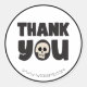Dé las gracias al estilo de Halloween con este pegatina lúdico que presenta letras en negrita y un gráfico del cráneo enclavado en el diseño. El aspecto limpio y moderno funciona bien para los bolsos de regalo, los favores de fiesta o los empaques de pequeñas empresas cuando se quiere un agradecimiento que se siente estacional pero refinado. Añade tu sitio web o texto personalizado en la parte inferior para que sea fácil hacerlo propio.