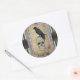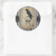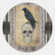 Una imagen gótica oscura de halloween con un cráneo, un hermoso cuervo, colocado en un marco vintage sobre un fondo de rayas blancas y negras vestidas con una textura gruesa. © WickedlyLovely