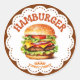 This round Hamburger sticker features a delicious illustration of a juicy burger stacked with lettuce, cheese, tomato, onion, and a sesame bun.