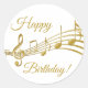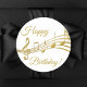 Un elegante fondo blanco con notas falsas de música dorada. Con el texto: ¡Feliz cumpleaños! Guión de estilo con letras de oro.