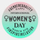 March 8th is International Women's Day button. Black and white key Women's Day sticker with female symbols and hashtags #genderequality and #inspireinclusion. Pink and teal background.
