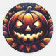 Este pegatina presenta una calabaza de Halloween resplandeciente y tallada con ojos amenazantes y una amplia sonrisa, rodeada de hojas de otoño bajo un cielo estrellado por la noche, que simboliza vibrantes vibraciones de otoño.