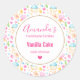 Pegatinas de productos de velas o jabón con un patrón delicioso y caprichoso. Corazones, cartas de amor, muffins, tulipanes y cerezas traen alegría y felicidad a este lindo y pequeño patrón. colores pastel bonito. Un círculo blanco con un falso borde de Relieve metalizado dorado sobre la parte superior con tu texto dentro.
