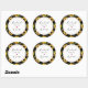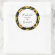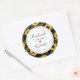 Hecho a mano con pegatinas de amor con un elegante y elegante patrón. girasoles amarillo bonito y hojas verdes rodeadas de delicadas cadenas de oro. Fondo negro. Un círculo con un falso borde de Relieve metalizado dorado sobre la parte superior con tu texto personalizado dentro.