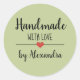Moderno pegatina "hecho a mano con amor" con una fuente negra en un fondo verde adornado por un lindo corazón rojo. Texto personalizado.
