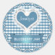 Un cálido diseño pegatina de aspecto hogareño para etiquetar tus productos de horneado o enlatados incluye el texto "Hecho con amor en mi cocina espero que disfrutes de cada bocado" envuelto en un corazón que sostiene tu nombre. Un banner de cinta para sostener el nombre de su producto se sienta debajo del corazón en un fondo de gingham en un círculo viciado. Vea otras opciones de color buscando el título 'Hecho con amor Gingham'.