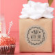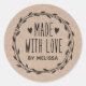 Un pegatina personalizado "hecho con amor" en un fondo color kraft rodeado de una corona de laurel y corazones. Hazlo tuyo añadiendo tu propio nombre. Un toque de bonito para todos tus regalos hechos a mano. Diseñado para ti por Blackberry Boulevard.