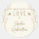 Hecho con Amor Línea de Arte Boceto Floral Dorado sobre Crema Etiqueta de Producto... Una elegante etiqueta redonda dorada y crema para tus regalos hechos a mano, alimentos horneados en casa o productos caseros a la venta. Bocetos florales de línea de arte bordean el texto que dice "Hecho con Amor por" seguido de tu nombre en tipografía de letra de moda. Puedes cambiar fácilmente el nombre y todo el texto en la plantilla de personalización.