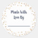"Hecho con amor por" pegatina con estrellas de oro y escritura azul de medianoche.