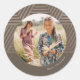 Este hermoso pegatina de vacaciones taupé neutro cuenta con una foto central con marco circular y una simple tipografía de Feliz Navidad. Este moderno pegatina también presenta un diseño geométrico a rayas metálicas falsas y un fondo natural de taupe. Vea esta colección festiva de temporada para opciones de color adicionales y tarjetas de Navidad de coordinación.
