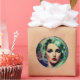 Echa un vistazo a este elegante y hermoso retrato de una mujer espacial con el universo como telón de fondo y un bonito halo verde alrededor de su cabeza adornado con flores de lavanda con un estilo retro de acuarela. ¡Hace un regalo perfecto!