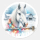 Pegatina Redonda Hermoso caballo blanco en Navidades de granjas