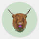 Retrato de una vaca escocesa de ardor de pelo. Un cardo escocés con nudo celta verde está delante de la vaca.