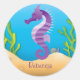 Un pegatina personalizado con un paraíso submarino con un personalizado morado de un caballito de mar nadando cerca del fondo del hermoso océano azul con plantas de agua y conchas marinas en el fondo. El texto es totalmente personalizable para su propio nombre. sgb01