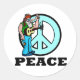 Hippie sosteniendo una guitarra con un signo de paz en el fondo.