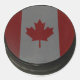 Un disco oficial de hockey con la bandera canadiense en la superficie.