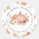 Etiqueta de dirección de devolución de acuarela pintada con flores de otoño, calabazas, hojas de otoño y calabacines, Pegatina Redonda Clásica. Etiqueta de dirección de devolución elegante que puede doblar como sello de sobre, añadiendo un toque final elegante a la presentación de su invitación. Tipografía de letra manuscrita junto con el nombre, dirección y monograma del remitente sobre un marco circular redondo simple moderno. Colores cálidos de otoño de naranja quemada, terracota, marrón, verde apagado y marfil. Pintado y diseñado gráficamente por la artista y diseñadora licenciada internacionalmente, Audrey Jeanne Roberts, derechos de autor.