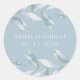 Hojas azul turbias boda personalizado Pegatina redondo clásico. Selle sus sobres de invitación o favores con estos elegantes y sencillos stickers de boda con sus nombres en blanco sobre un polvoriento fondo gris. Parte de una colección de bodas. Revisa mi tienda para ver toda la suite boda para este diseño!
