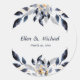 Hojas azules con Pegatina redondo clásico Boda de oro diseñado con hojas delicadas y suaves en tonos de Marina Oscura, y Azul claro, acentuado con resaltes de color oro. El texto incluye: el Primer Nombre y Fecha Boda de la Novia y Groom. Para personalizar, simplemente inserte sus detalles en nuestra plantilla sencilla, reemplazando el texto de ejemplo. Asegúrese de ver todas las hojas azules con colección de Bodas dorados para piezas coincidentes.