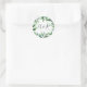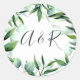 Este pegatina redondeado presenta iniciales de estilo escrito a mano rodeadas de follaje de eucalipto verde sobre un fondo blanco puro. Forma parte de una suite boda a juego. Puede cambiar las iniciales en el menú personalizar.