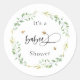 Un diseño pegatina redondo con la frase Es una ducha de agua con pequeñas abejas, rodeada de una delicada corona en tonos verde suave. Se coordina maravillosamente con nuestras invitaciones a la ducha de bebé y más.