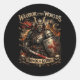 A ferociously powerful dark fantasy illustration of a hybrid samurai-knight warrior with glowing red eyes charging through a blazing battlefield, wielding a bloodied sword and battle-scarred shield against a backdrop of fire, arrows, and crumbling castle ruins.
