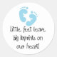 Diseño de huellas azules de bebé con texto negro que dice "¡Los pies pequeños dejan grandes huellas en nuestro corazón!" en camisetas de recién nacido o futuro bebé, tazas, ratones, ratones, bolsos de tote, botones, cadenas de teclas y más!