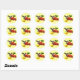 Este pegatina presenta un colibrí hembra gaviota. Se atrapa en el aire mientras bebe néctar del centro dorado de una flor de zinnia roja brillante. Cerca hay una flor de zinnia amarilla y algunas hojas verdes completan la composición. Los colores parecen brillar sobre el fondo amarillo pálido.